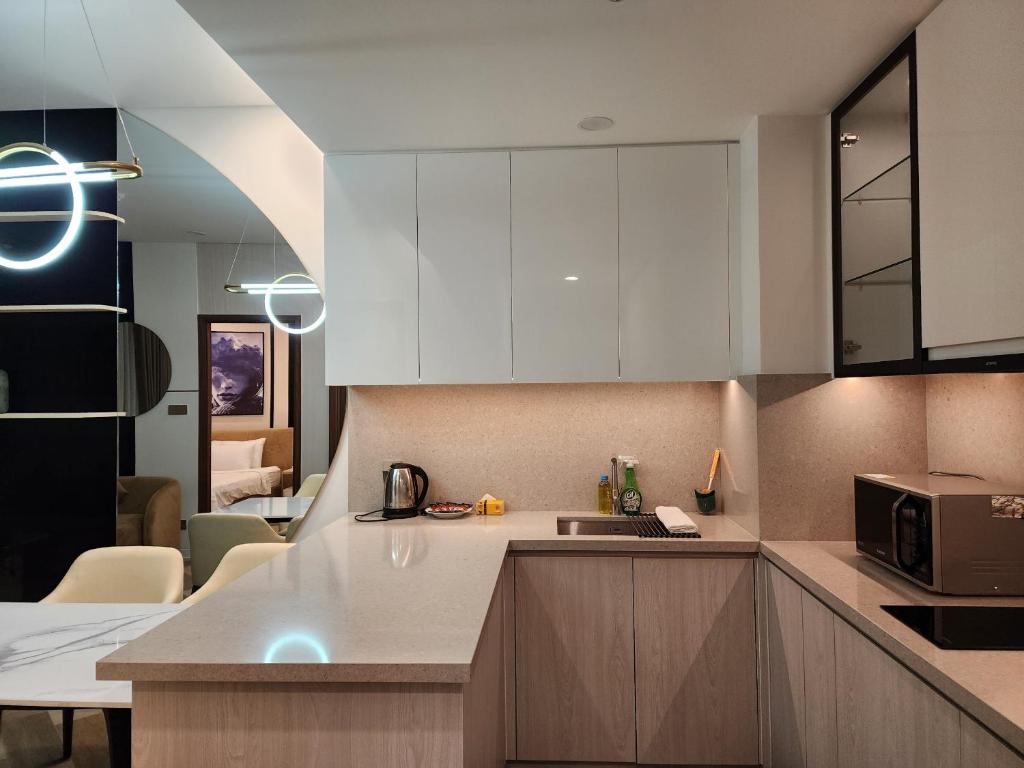 Ceramic tiled flooring, Granite counter top , Single bowl stainless steel kitchen sink with drain board and provisions for water purifier , electric hood , exhaust fan will be provided