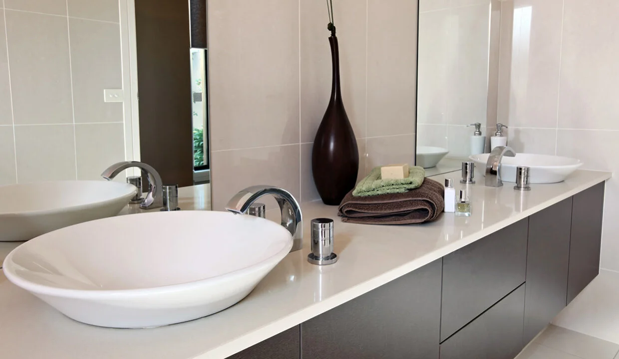Anti-skid Ceramic tiles on floor and ceramic wall tiles up to 7 feet height. White coloured branded sanitary fittings, Chromium plated taps , concealed plumbing