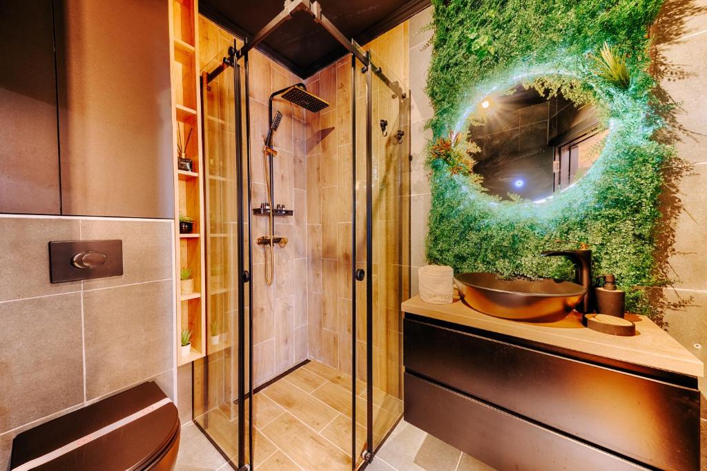 Anti-skid Ceramic tiles on floor and ceramic wall tiles up to 7 feet height. White coloured branded sanitary fittings, Chromium plated taps , concealed plumbing