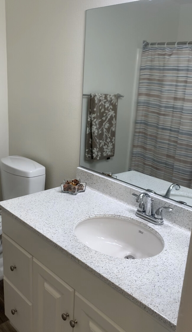 Anti-skid Ceramic tiles on floor and ceramic wall tiles up to 7 feet height. White coloured branded sanitary fittings, Chromium plated taps , concealed plumbing